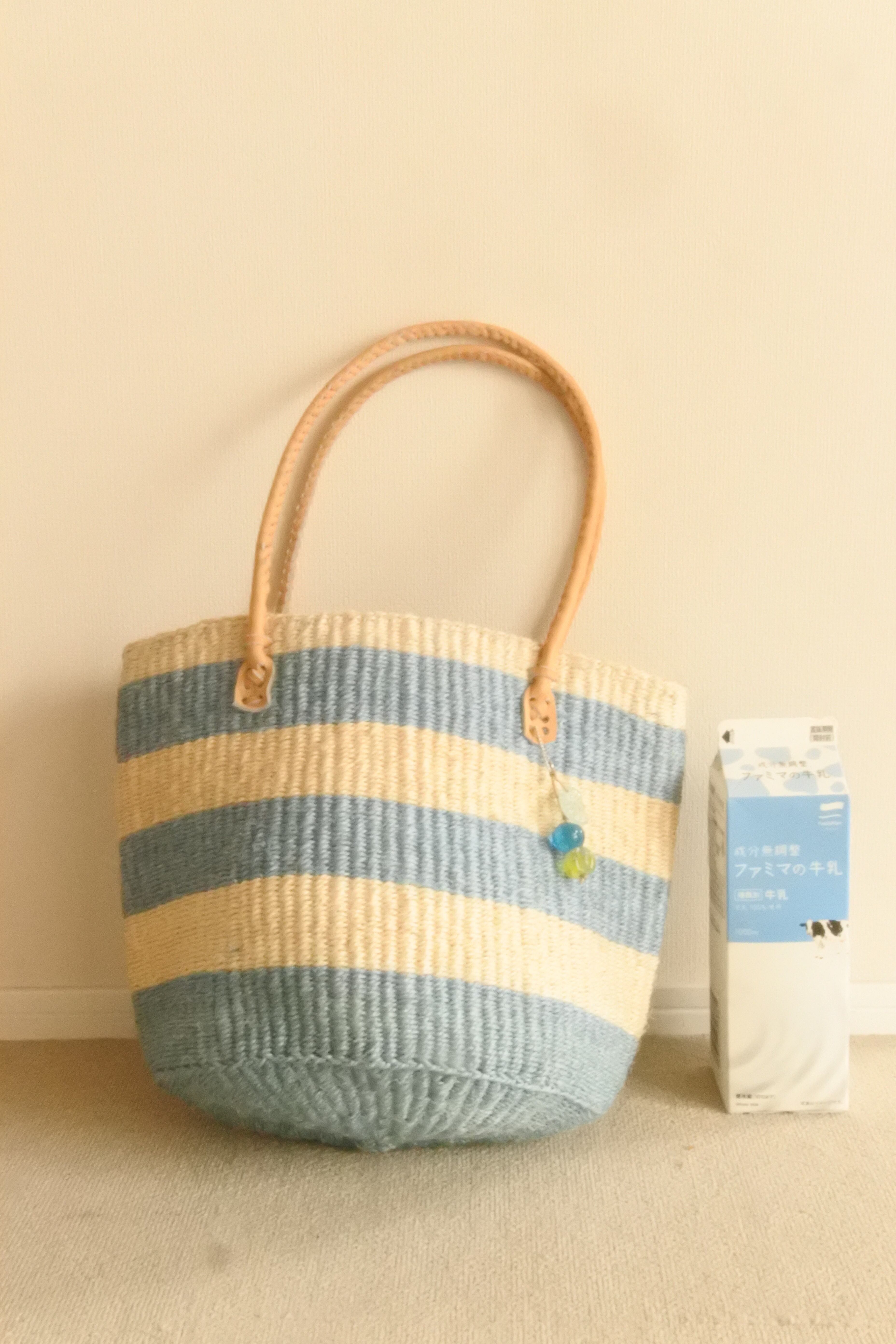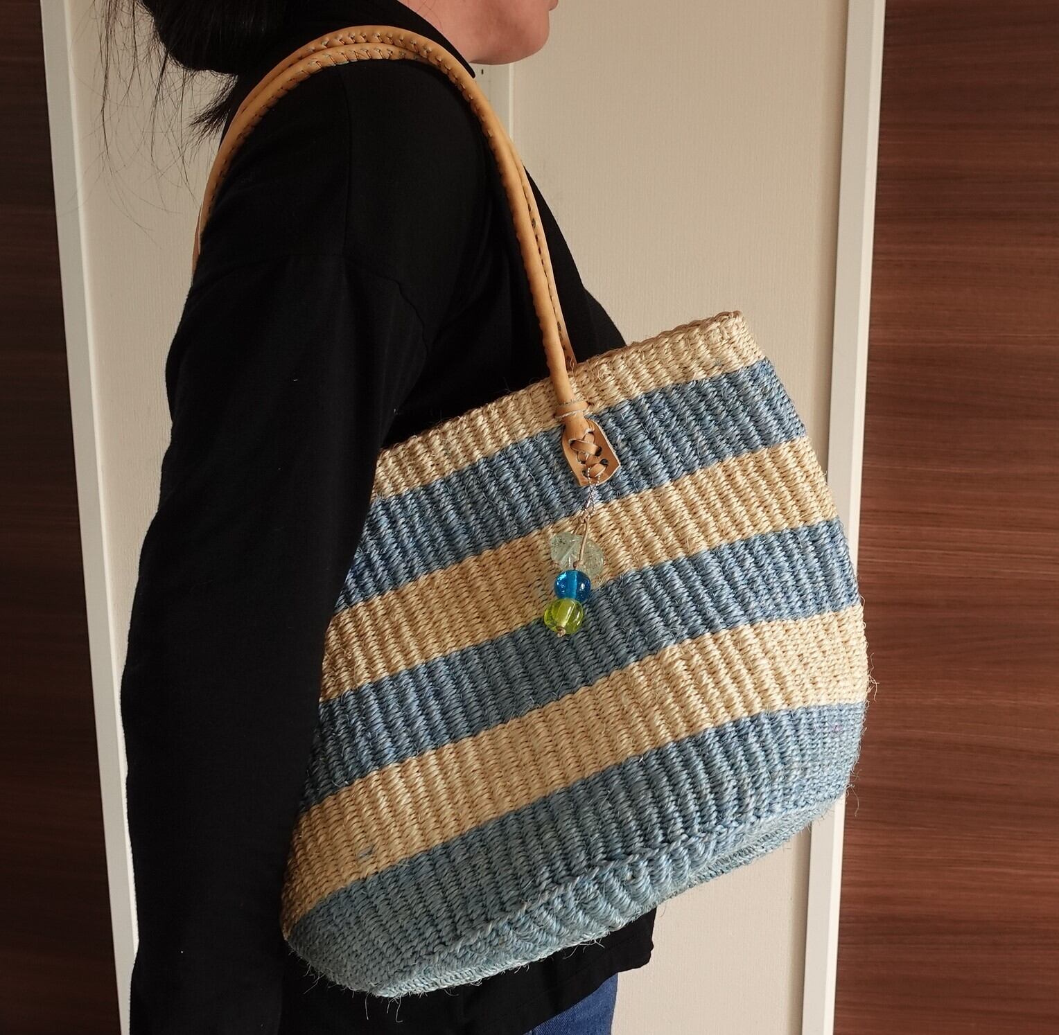 ケニアのお母さんたちが作ったサイザルバッグです。ケニアのガラス玉のチャームをつけました。幅 およそ38㎝、高さ(持ち手のぞく) およそ26cm、底の直径 およそ26cmです。(色落ちする場合がありますので、ご注意ください。)