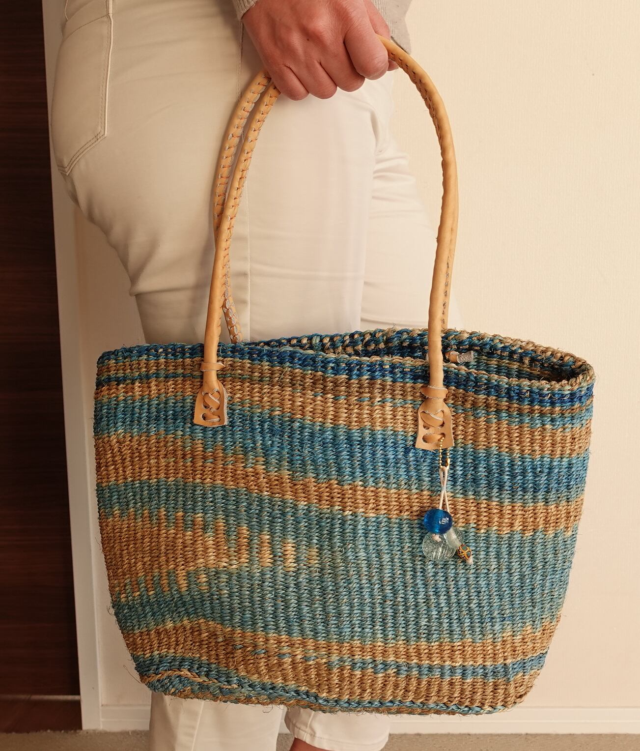 ケニアのお母さんたちが織ったサイザルバッグです。ケニアのガラス玉のチャームをつけました。幅 およそ39㎝、高さ(持ち手のぞく) およそ24cm、底の直径 およそ29cmです。(色落ちする場合がありますので、ご注意ください。)