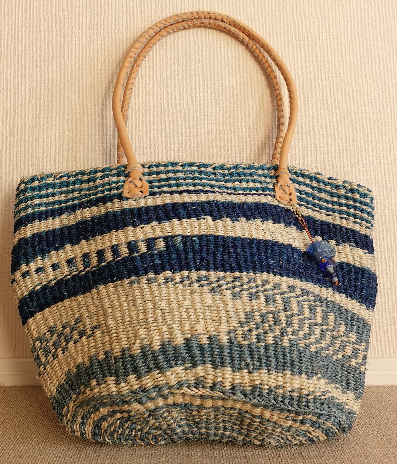 ケニアのお母さんたちが織ったサイザルバッグです。ケニアのガラス玉のチャームをつけました。幅 およそ43、高さ(持ち手のぞく) およそ26cm、底の直径 およそ26cmです。(色落ちする場合がありますので、ご注意ください。)