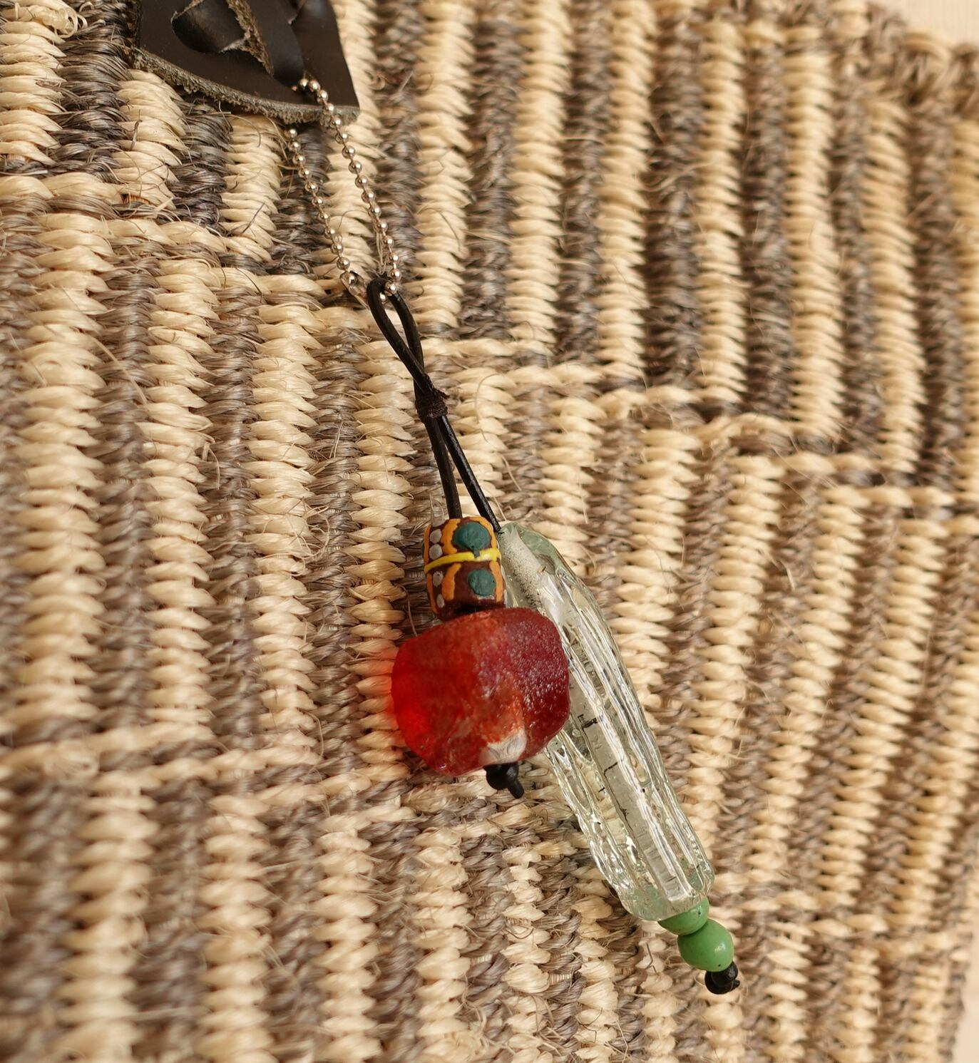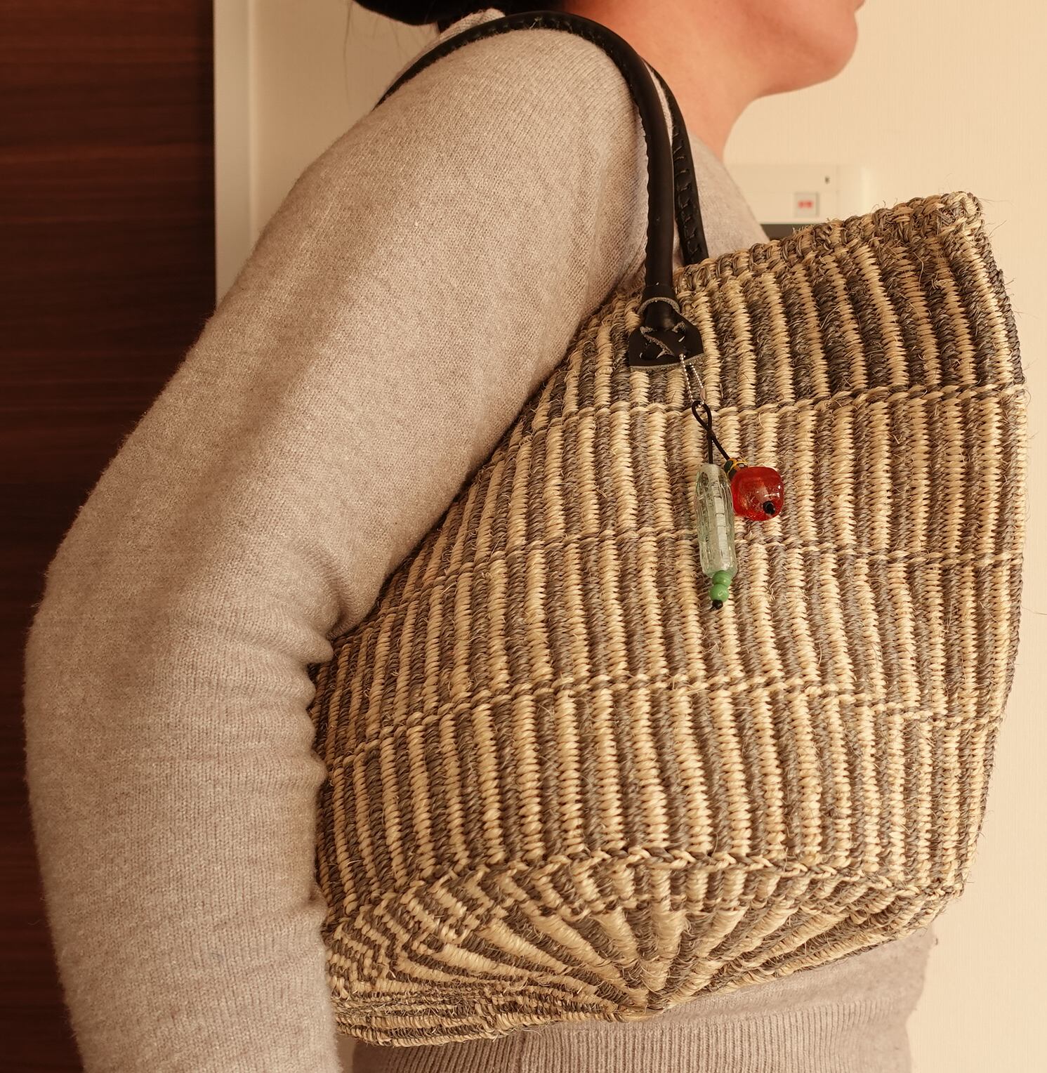 ケニアのお母さんたちが織ったサイザルバッグです。ケニアのガラス玉のチャームをつけました。幅 およそ38㎝、高さ(持ち手のぞく) およそ24cm、底の直径 およそ24cmです。(色落ちする場合がありますので、ご注意ください。)