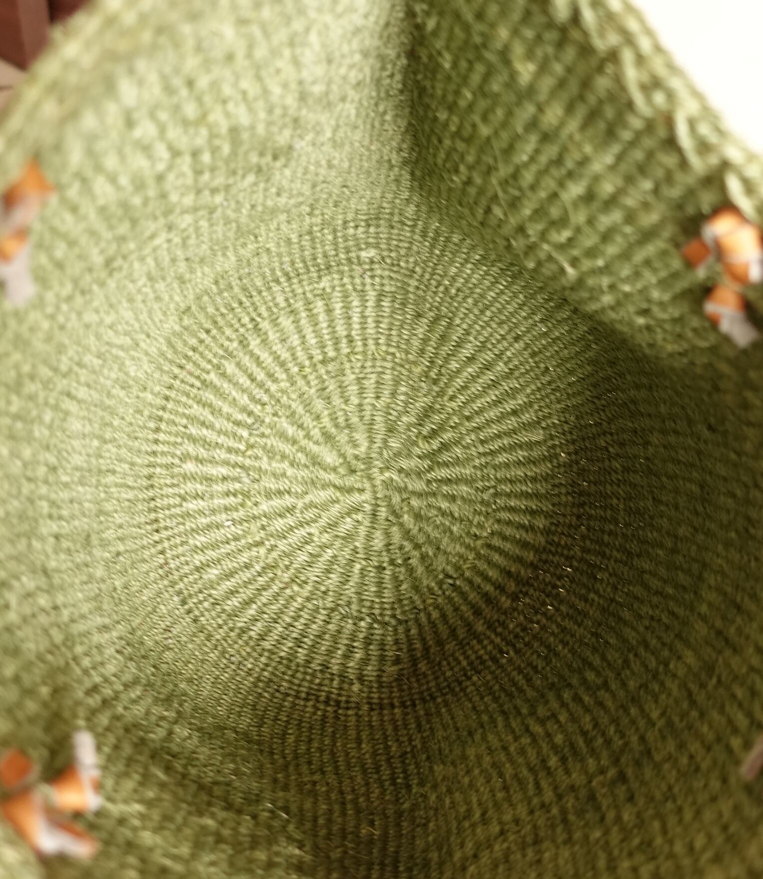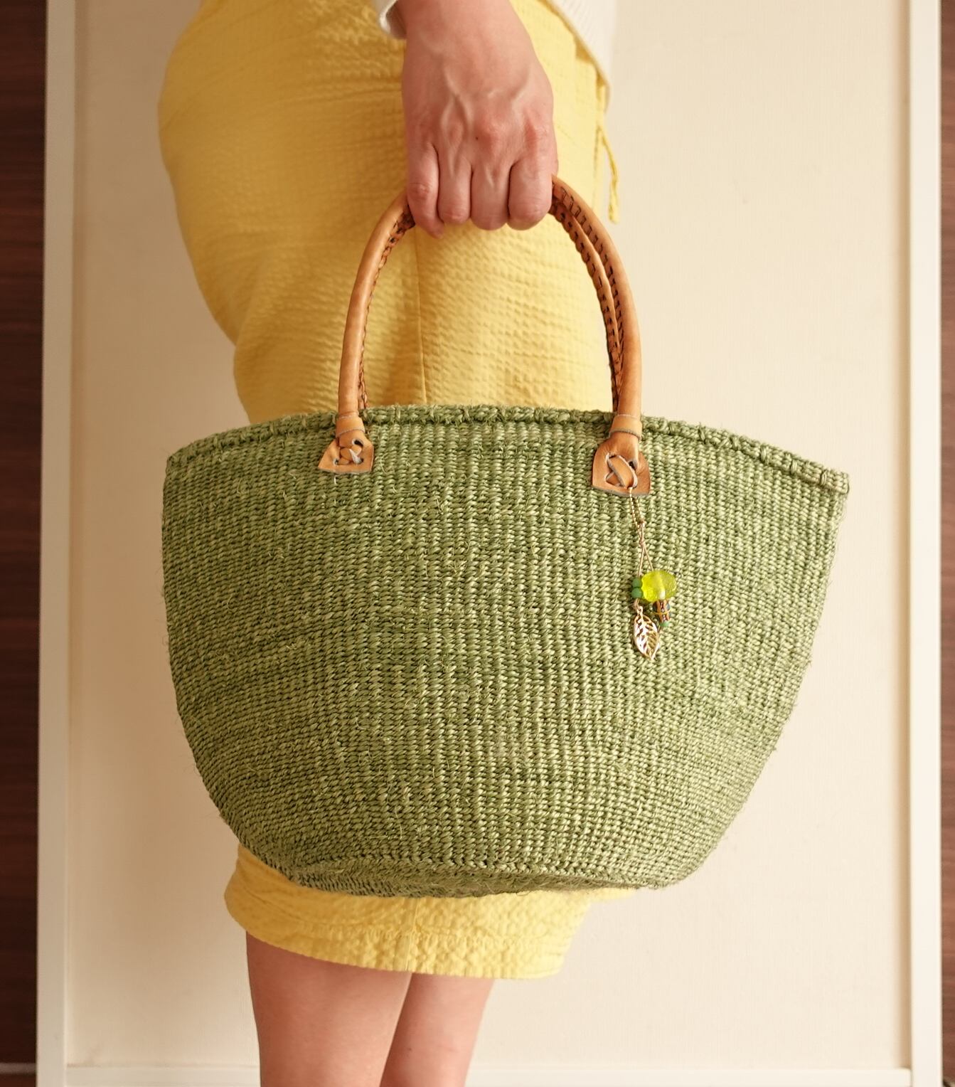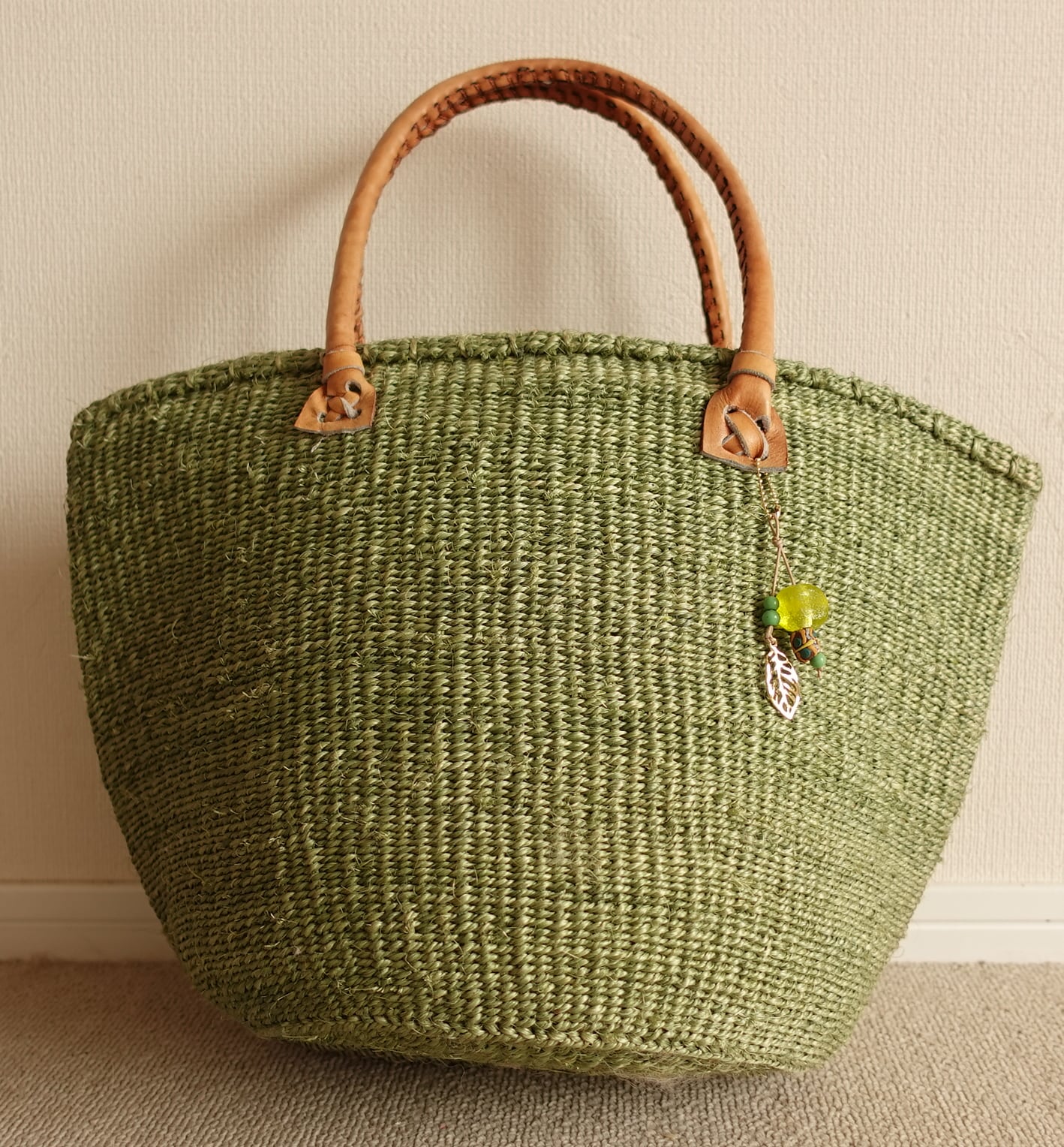 ケニアのお母さんたちが編んだサイザルバッグです。ケニアのガラス玉のチャームをつけました。幅 およそ37㎝、高さ(持ち手のぞく) およそ23cm、底の直径 およそ20cmです。(色落ちする場合がありますので、ご注意ください。)